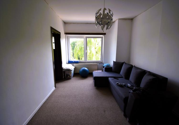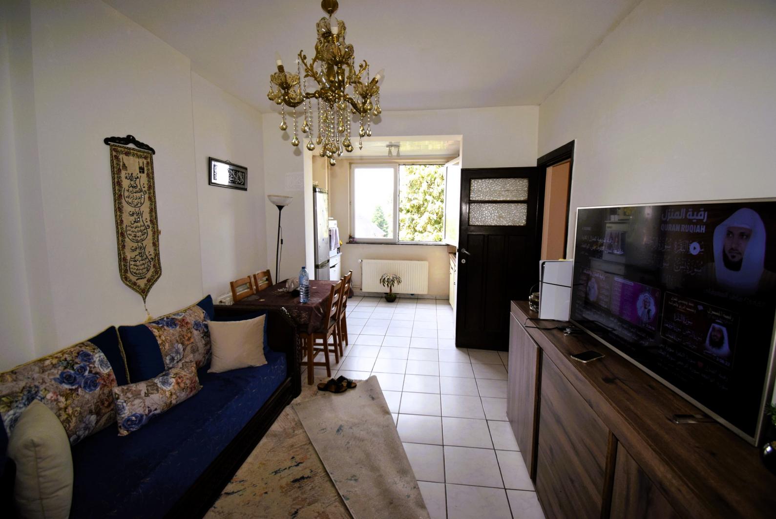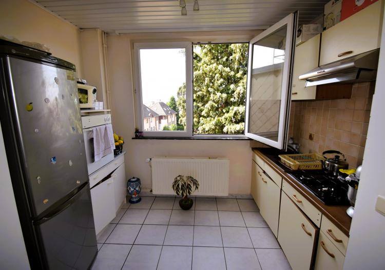 Rue de Dilbeek 89, quartier calme et résidentiel à la frontière de Dilbeek : Appartement deux chambres de 65m² avec cave. Petit immeuble sans charges, double vitrage, chauffage individuel au gaz, installation électrique conforme. Troisième étage sans ascenseur.