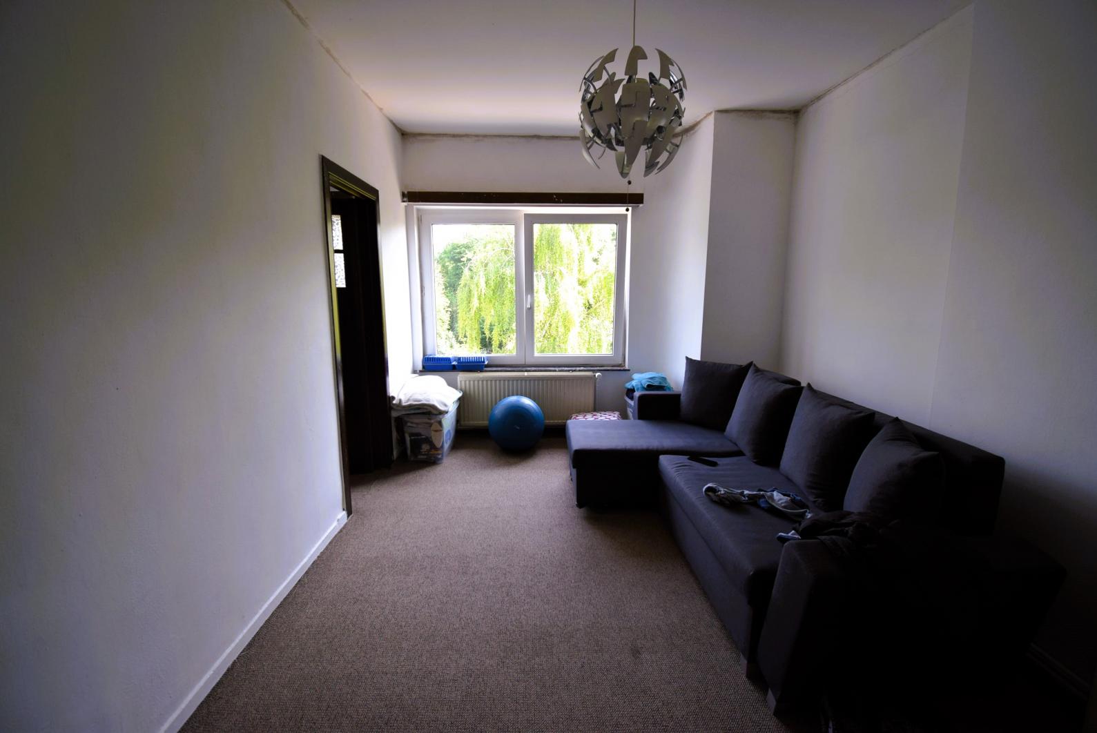 Rue de Dilbeek 89, quartier calme et résidentiel à la frontière de Dilbeek : Appartement deux chambres de 65m² avec cave. Petit immeuble sans charges, double vitrage, chauffage individuel au gaz, installation électrique conforme. Troisième étage sans ascenseur.