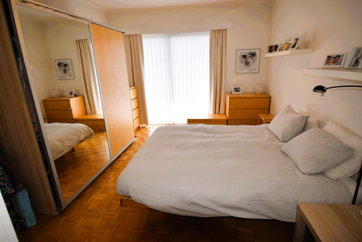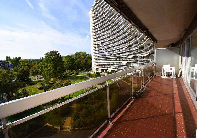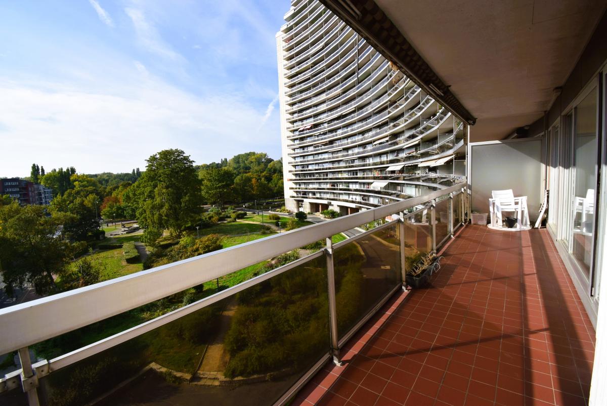 Boulevard Edmond Machtens 151, dans la résidence « Arc-en-ciel » face au Parc du Scheutbos : Spacieux et lumineux appartement trois chambres de 120m² avec deux grandes terrasses de 12 et 23m² avec tente solaire. Trois "vraies" chambres de 15,14 et 13m², porte blindée, installation électrique conforme. Situation résidentielle et verdoyante à proximité de toutes les commodités. Possibilité d'acquérir un garage séparément